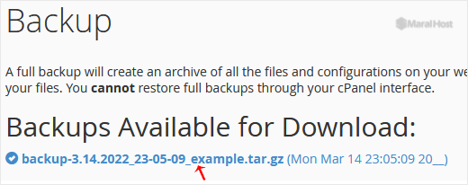 پس از اتمام پشتیبان گیری از سی پنل، یک اعلان دریافت خواهید کرد. میتوانید نسخههای پشتیبان را از مسیر Backup > Download a Full Account Backup دانلود کنید.