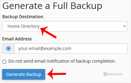 4. از منوی باز شده، مقصد پشتیبان را به عنوان Home انتخاب کنید و آدرس ایمیل خود را در قسمت ایمیل وارد کنید تا پس از اتمام بکاپ گیری، اعلان دریافت کنید.