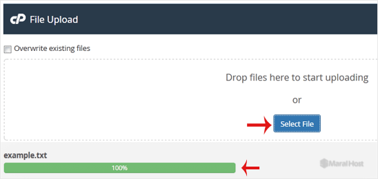 5. بر روی Select File کلیک کنید و فایلی را که میخواهید از سیستم خود آپلود کنید انتخاب نمایید. روی open کلیک کنید و فرآیند آپلود آغاز خواهد شد. همچنین میتوانید فایلها را از سیستم خود در کادر آپلود بکشید و رها کنید.