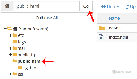 3. در بخش فایل منیجر cPanel، به Directory که میخواهید فایلهای خود را در آن آپلود کنید بروید. به عنوان مثال، اگر میخواهید فایلهای خود را در دایرکتوری public_html آپلود کنید، ابتدا باید به /public_html بروید. در سمت چپ، در لیست دایرکتوریها بر روی فولدر public_html دوبار کلیک کنید.