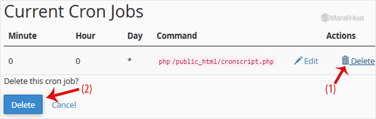 1. در قسمت Current Cron Jobs، cronjob خود را پیدا کرده و روی Delete کلیک کنید.
