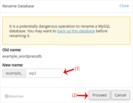 4. نام دیتابیس را تغییر داده و سپس روی Proceed کلیک نمائيد.