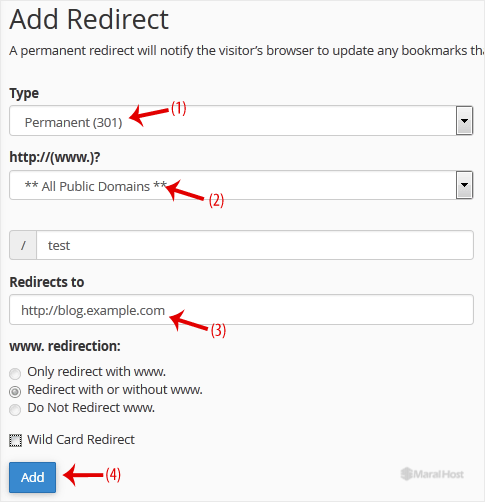 3. در قسمت Add Redirect، باید جزییات زیر را وارد کرده و گزینه‌های مناسب را انتخاب کنید.