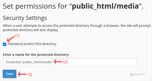 5- در قسمت Security Settings، علامت Password protect this directory را بزنید. سپس بر روی Save کلیک کنید.