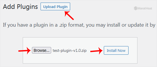 3- بر روی Upload Plugin و سپس Browse کلیک کنید. فایل فشرده (zip) افزونه خود را انتخاب و بر روی Install Now کلیک نمایید.